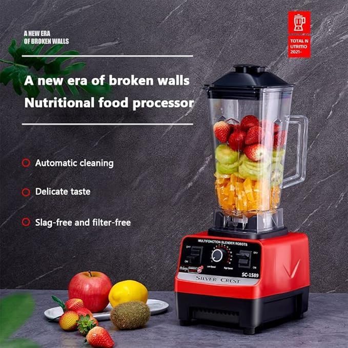 The Heavy Duty Commercial Grade Blender Juicer is a powerful and versatile kitchen appliance designed to deliver professional-grade results for both home and commercial use. Equipped with a high-performance motor and a 6-blade stainless steel system, this blender efficiently handles all blending tasks, from crushing ice for smoothies to pureeing fresh fruits, vegetables, and sauces. Whether you're preparing frozen beverages, fresh juices, soups, or food processing, this blender ensures consistent, smooth results every time.