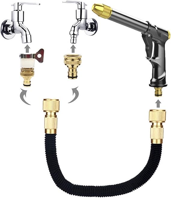 This expandable hose automatically extends when water flows through it and contracts back for compact storage when not in use. Its flexible construction prevents tangles and kinks, providing a smooth and hassle-free watering experience. Compatible with most standard spray nozzles, it includes a car wash gun attachment for added convenience, making it perfect for a wide range of applications.