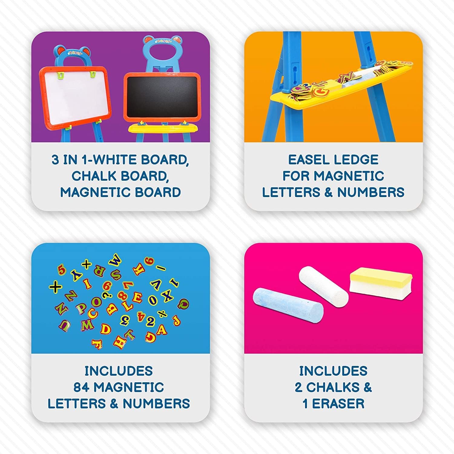 This easel’s height-adjustable design allows it to grow with your child, making it suitable for toddlers, preschoolers, and early school-age kids. The magnetic board supports learning through play, allowing children to practice with magnetic letters, shapes, or numbers, while the chalkboard and dry erase board encourage drawing, writing, and storytelling.