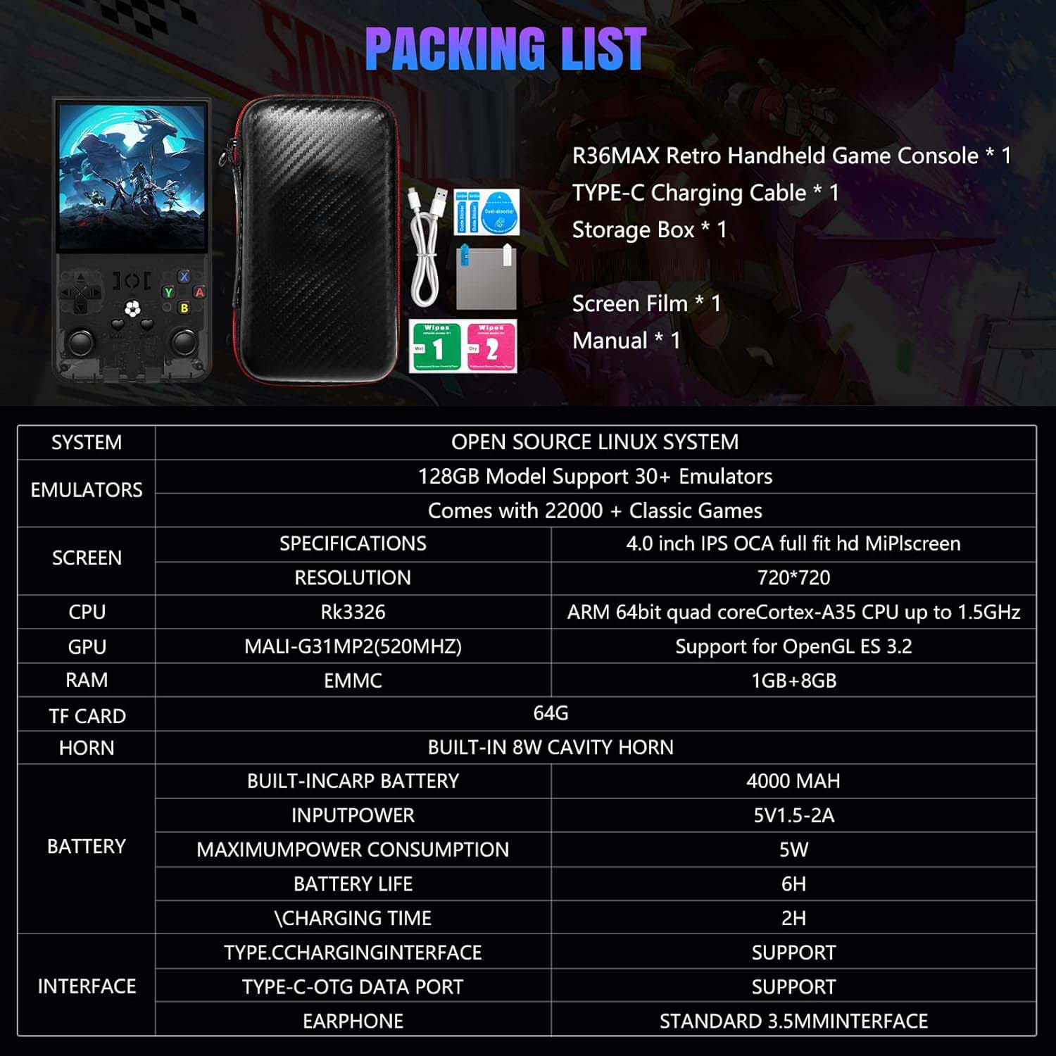 Dive into the ultimate retro gaming experience with the R36MAX Retro Handheld Console. With 128GB storage and 22,000 preloaded games, you can enjoy endless entertainment anytime, anywhere.